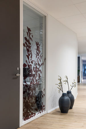 Grafísk smiðja hefur hannað töluvert af sérhönnuðum glerfilmum bæði fyrir skrifstofur og heimili. Þetta geri ég mjög oft í samstarfi við hönnunarstútíó Katrínar Ísfeld innanhússarkíteks. Möguleikarnir eru óendanlegir og reynir hönnunin oft á tæknilega getu prentunar á filmu.